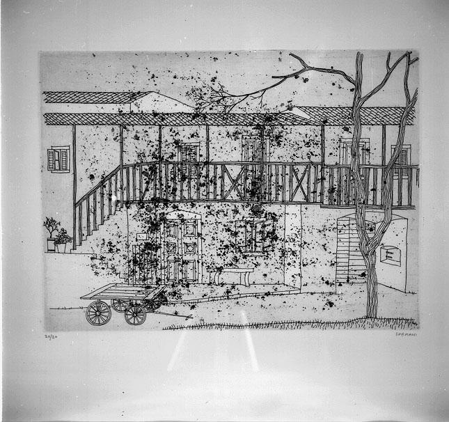 Facciata di casa carsica con ballatoio di legno su tutta la larghezza, al quale si accede da una breve scala a sinistra. In primo piano, a sinistra, carretto e, a destra albero nudo tracciato a sottili righe verticali. Monocromo color seppia tracciato all'acquaforte con particolare uso dell'acquatinta, che crea delle macchie irregolari nella parte centrale della composizione.