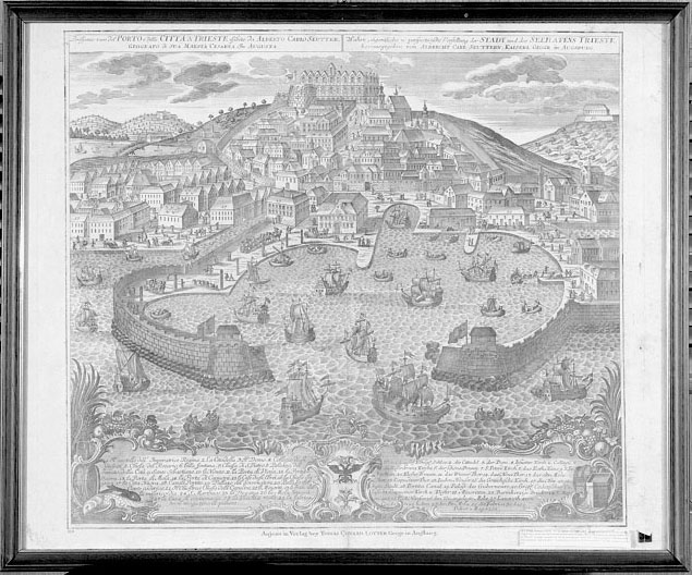 in alto: Prospetto vero del PORTO e della CITTA' di TRIESTE, esibito da ALBERTO CARLO SEUTTER,/ GEOGRAFO di Sua MAESTA' CESAREA In AUGUSTA [...]