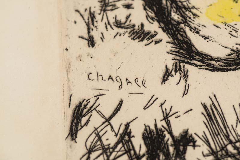Nel 1927 il famoso editore e mercante d'arte Ambroise Vollard commissionò a Chagall l'illustrazione di una nuova edizione delle Favole di La Fontaine. L'artista aveva già lavorato nel 1923 per Vollard, che gli aveva dato l'incarico di eseguire una serie di acqueforti per illustrare un'edizione de Le anime morte di Gogol, pubblicata nel 1924-1925. Nel 1927 perciò Chagal iniziò ad eseguire le cento acqueforti, ma il progetto non andò in porto per l'improvvisa morte nel 1939 di Vollard e solo nel 1952 l'editore Tériade pubblicò Les Fables de La Fontaine in due volumi, corredati da cento acqueforti di Chagall, con una tiratura di duecento esemplari. I primi ottantacinque esemplari presentano le cento stampe acquarellate a mano dall'artista, e da questo gruppo proviene anche l'acquaforte di collezione Astaldi. Nella stampa Chagall abbandona il mondo del fantastico protagonista di molte sue opere e, per le necessità di aderenza al testo della fiaba, crea un'illustrazione di natura didattica, caratterizzata da una forte aderenza al dato naturale nella resa della lepre che salta irrompendo nello stretto spazio compositivo, delimitato in alto dalla stoccianata del campo.