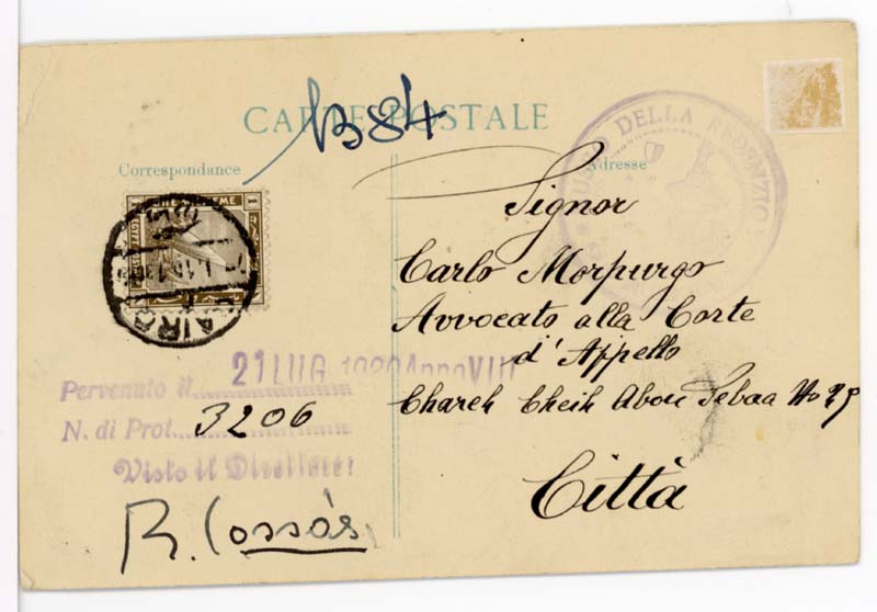 verso, a destra: Signor / Carlo Morpurgo / Avvocato alla Corte / d'Appello / Chareh Cheih Abou el Sebaa / N.o 25 / Città