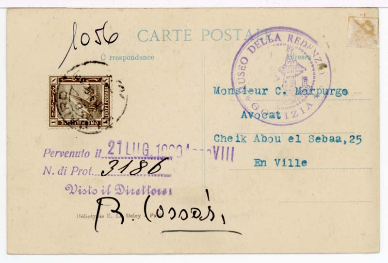 verso, a destra: Monsieur C. Morpurgo / Avocat / Cheik Abou el Sebaa, 25 / En Ville