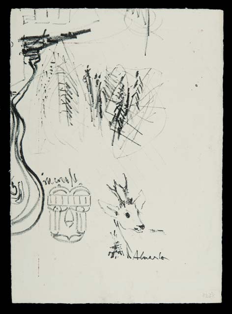 Sul verso si distinguono tre nuclei disegnativi a matita grassa: a sinistra e in alto, intersezioni di tratti e segmenti di linea; in basso, un motivo figurativo e una testa di giovane cervo.