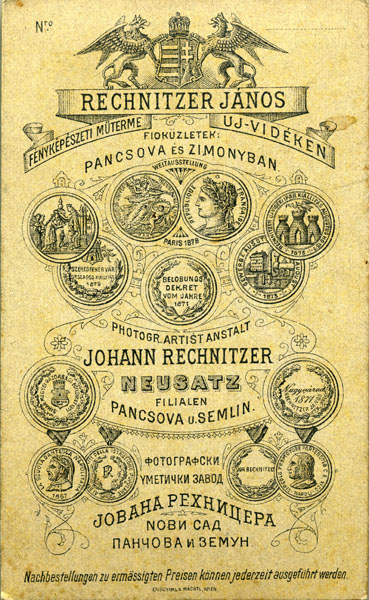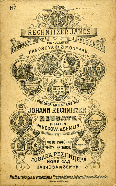 Rechnitzer Jànos/ Joh Rechnitzer/ Neusatz/ Uj-Vidéken/ Exposition Universelle Paris 1878/ Berlobunos Dekret Vdm Jahre 1871/ Nachbestellungen zu Ermassigten Preisen/ Konnen Jederzeit Ausgefuhrt Werden