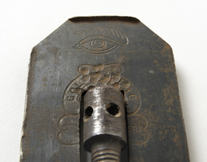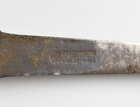 Occhio umano posto superiormente al nome della ditta, Goldenberg, e ad altre scritte complementari (acier fondu a garantie/ brevete sgdg) inscritte in figure geometriche/decorative dal perimetro curvato.