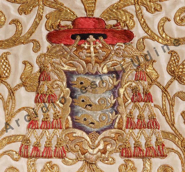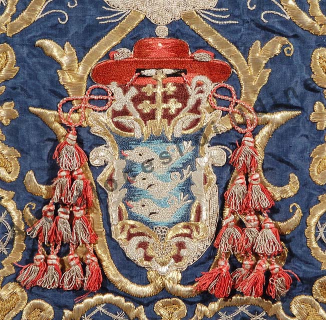 Campo d’azzurro a tre delfini posti 1, 1, 1. Scudo sagomato, accollato ad una croce astile patriarcale d’oro, trifogliata, posta in palo, timbrato da un galero con cordoni e nappe in rosso, spada e baculo al lato. Le nappe in numero di venti sono disposte dieci per parte in ordini di 1, 2, 3, 4.