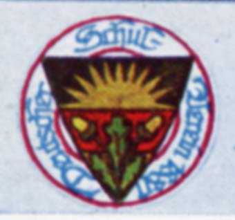 Circolare, lungo la circonferenza scritta DEUTSCHER SCHUL-VEREIN 1880; al centro stemma con sole sorgente in alto e foglie di quercia e ghiande al di sotto.